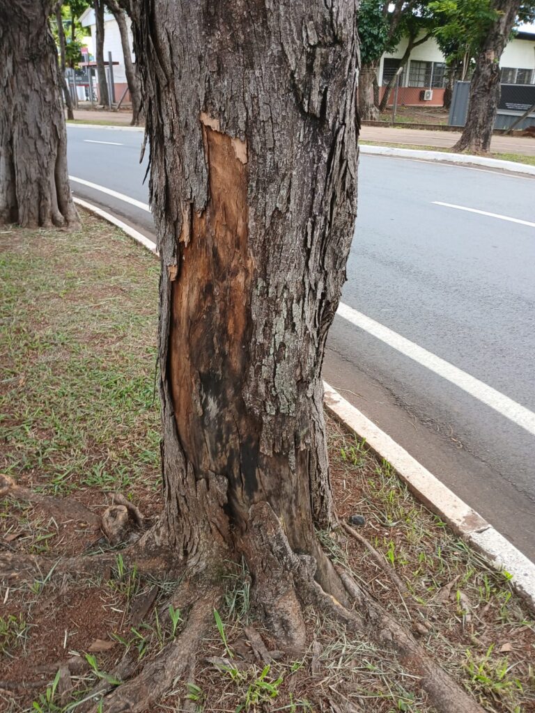 Após chuvas fortes, verifique se há novas fendas no solo ao redor da base e se galhos grandes ficaram pendurados na copa. Observe também se a árvore apresenta uma inclinação que não existia anteriormente, o que indica instabilidade nas raízes saturadas pela água.